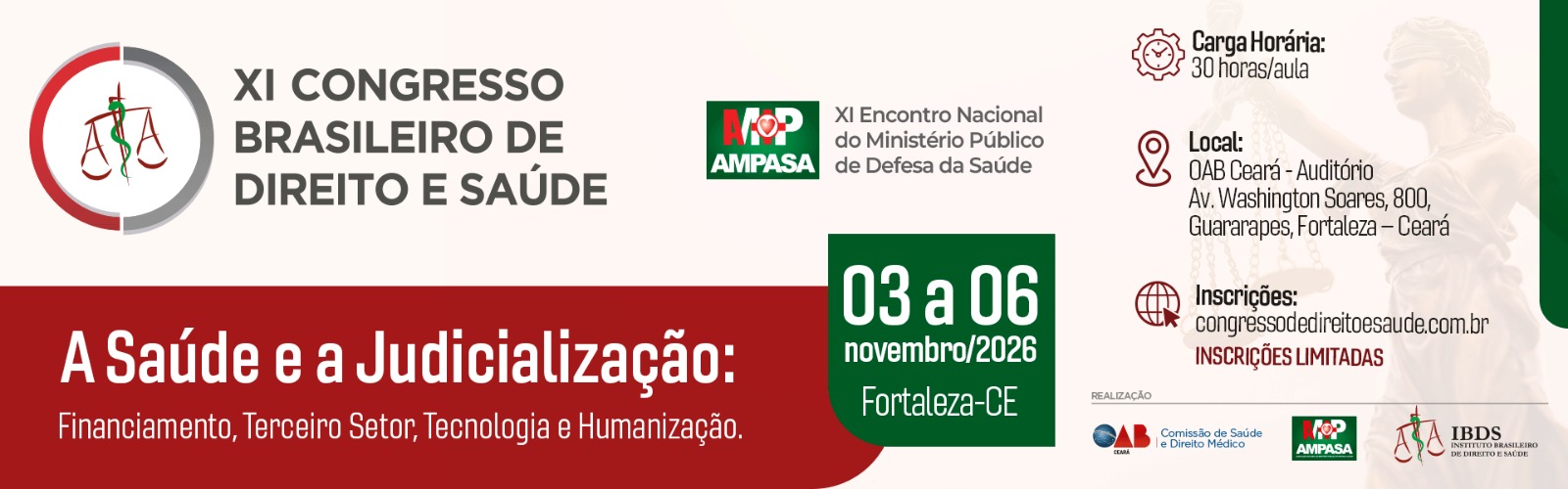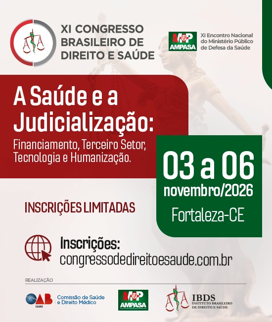 O XI CONGRESSO BRASILEIRO DE DIREITO E SAÚDE, será realizado de 03 a 06 de novembro de 2026, no Auditório da OAB Ceará, localizado na Av. Washington Soares, 800 – Bairro: Guararapes, em Fortaleza/CE.